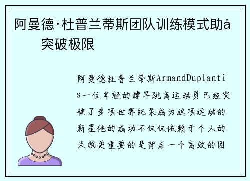 阿曼德·杜普兰蒂斯团队训练模式助力突破极限